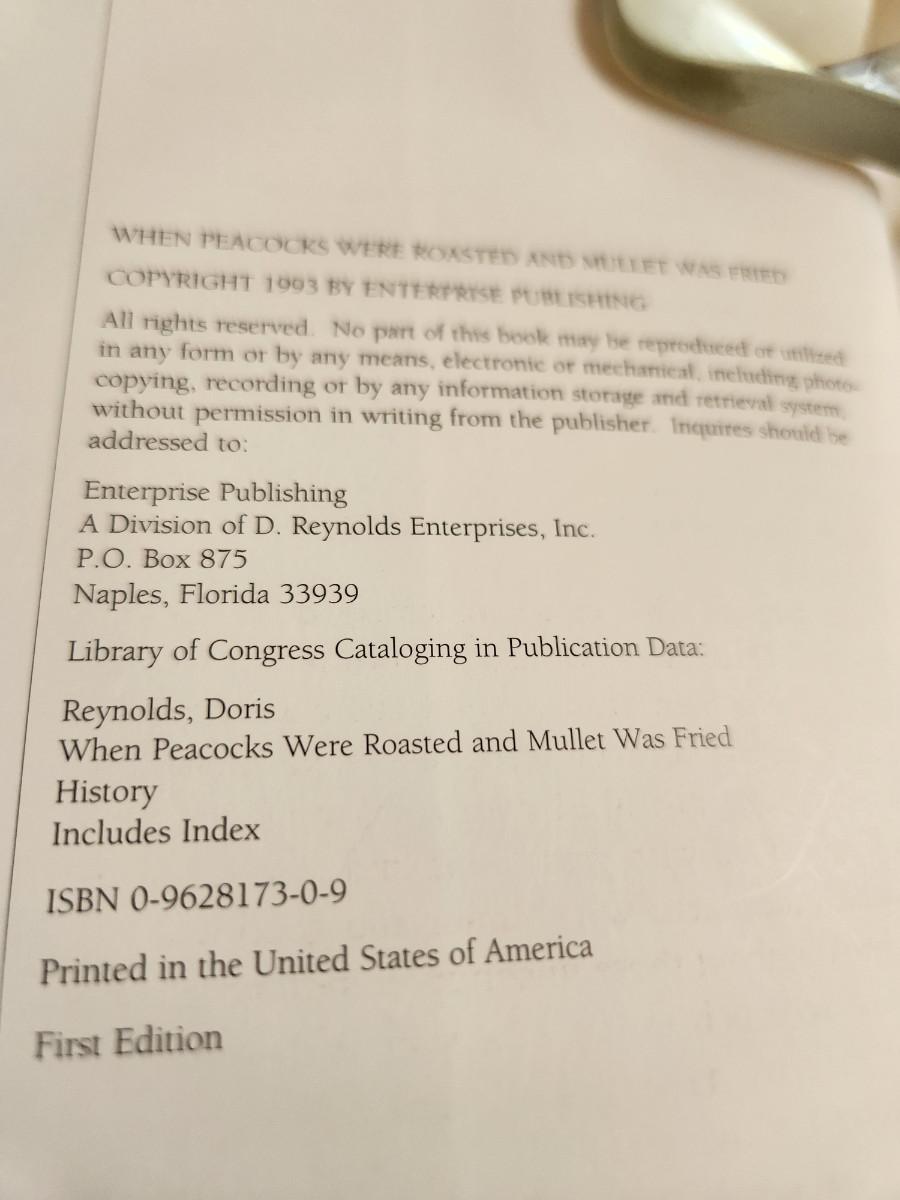 This auction lot is for a very crisp copy of When Peacocks were Roasted and Mullet was Fried by Doris Reynolds - Autographed by the author. This book of tales of Naples, Florida is a rare find for any pan-handled state historians. Published by Enterprise, 1993. Hardbound and in as new condition including its dust jacket. 176 Pages.