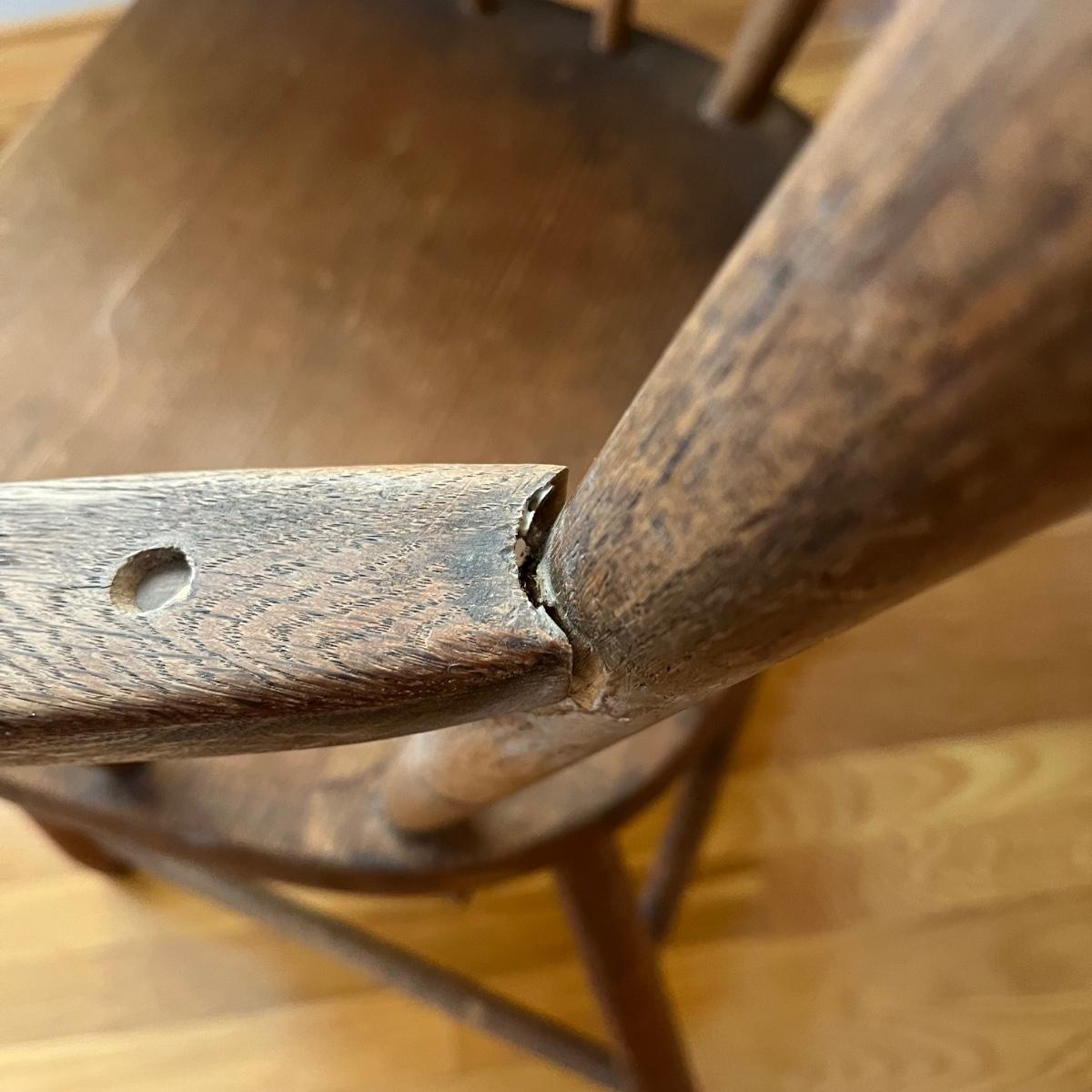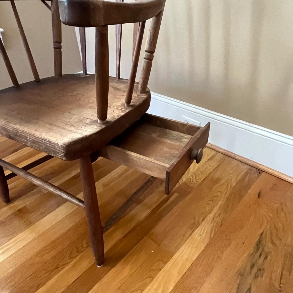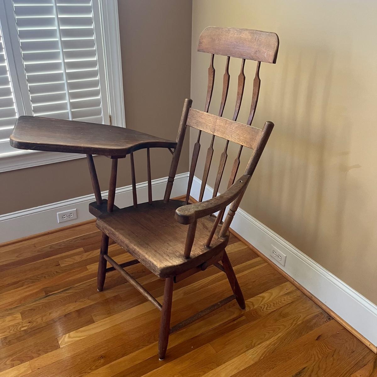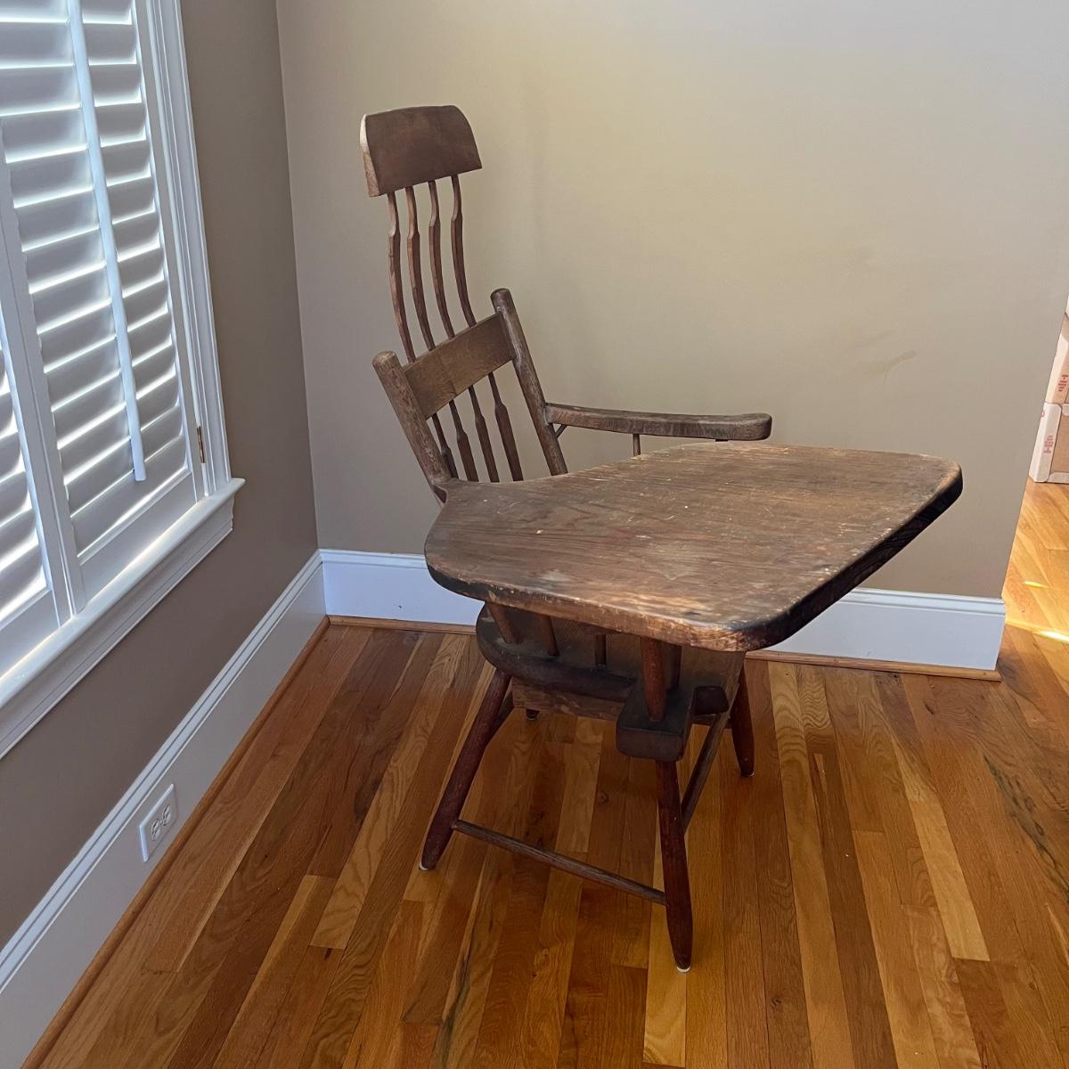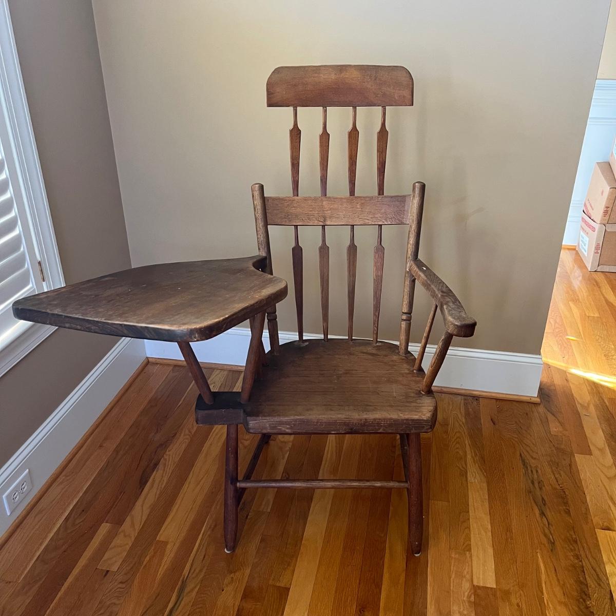 Solid wood Windsor Comb back-style chair with attached writing desk and small side drawer under the seat. Chair is slightly wobbly and shows signs of wear. The left arm rest needs to be reglued. Overall it measures 39” x 22.5” x 46”H. The seat height is 18”H and desktop is 18.5” x 26”.