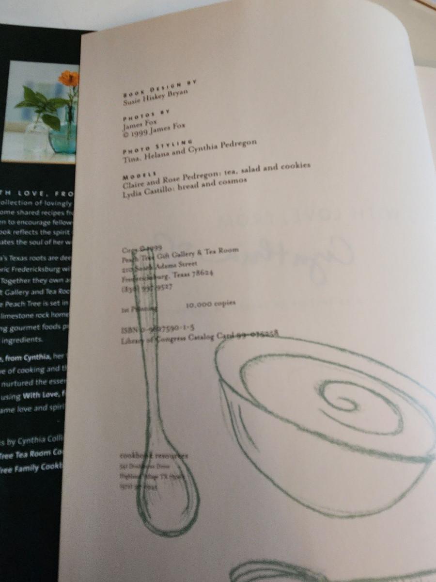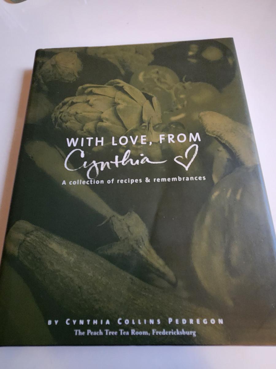 This cookbook, With Love, From Cynthia by Cynthia Collins Pedregon is from the proprietor of the Peach Tree Tea Room located in Fredericksburg, Texas. It is a collection of recipes and remembrances. This is a hardback book with dust cover in as new condition. Published by Cookbook Resources, 1999, 258 pages.