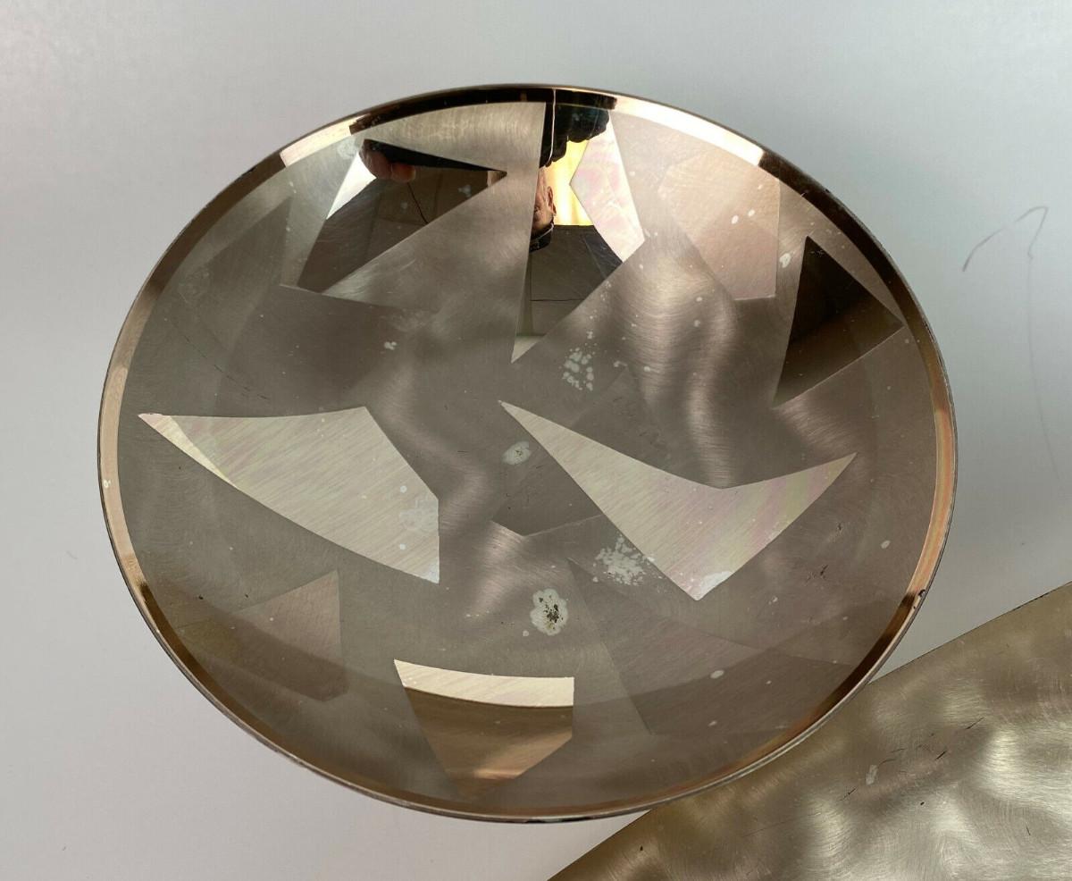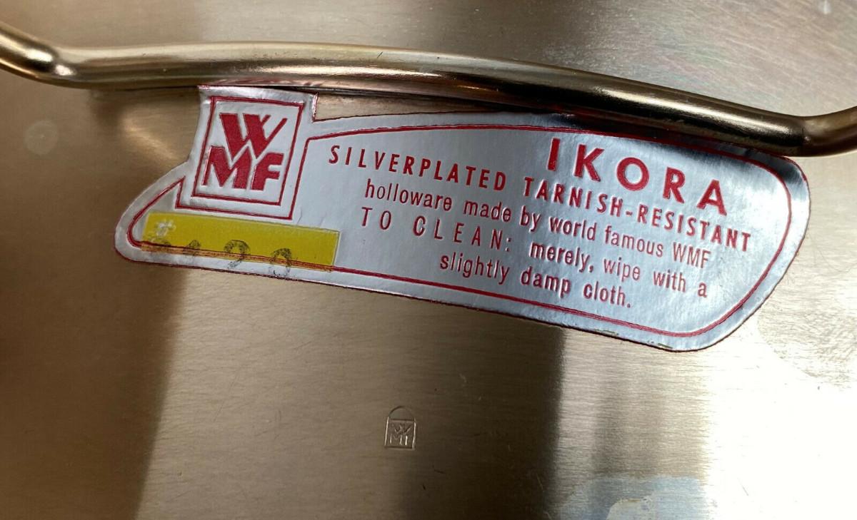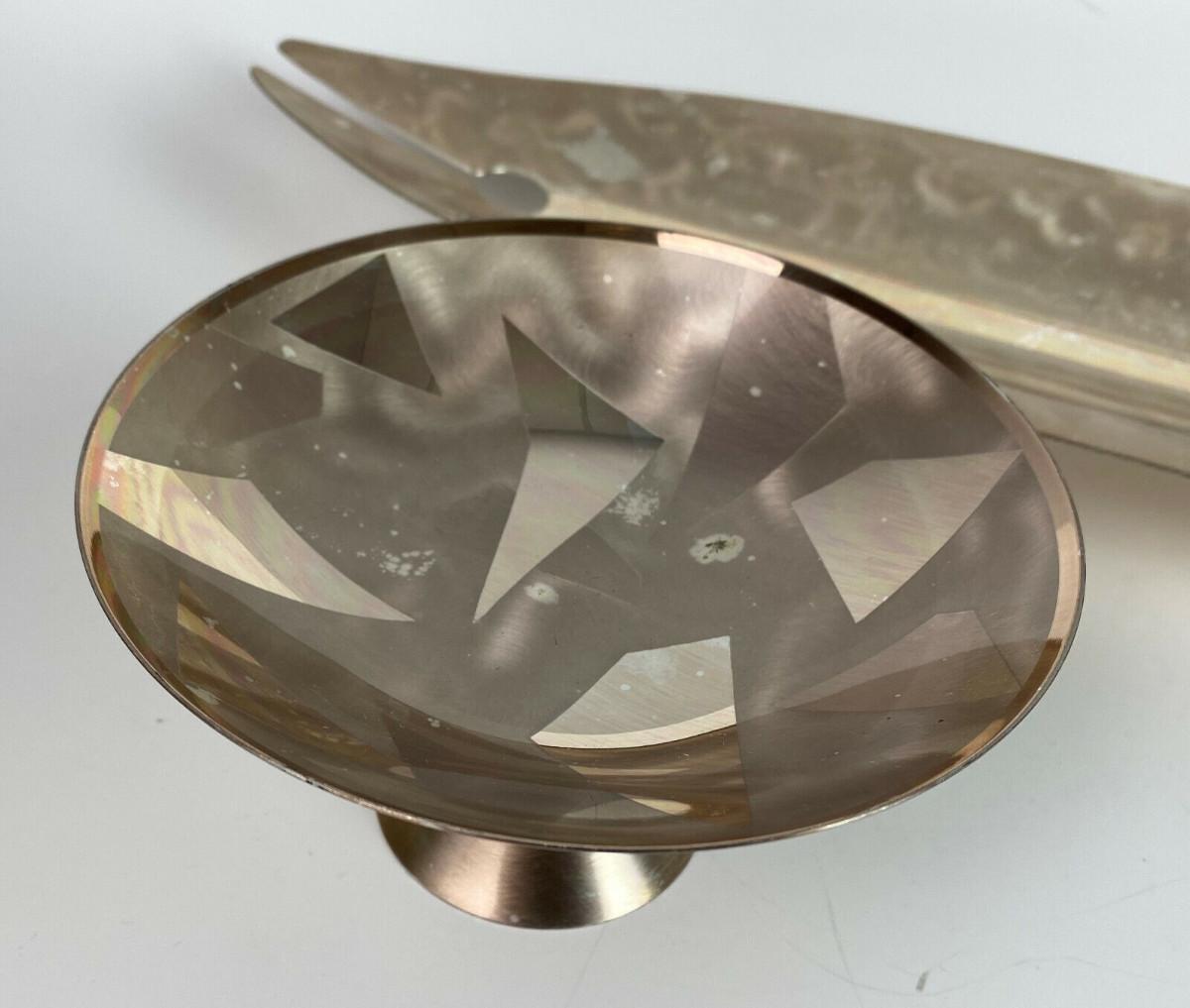 Here are a pair of Mid Century Modern trays from the Ikora line of silverplate holloware by WMF(Wurttembergische Metallwarenfabrik)...The Space Age geometric shapes are great but there is a fair amount of wear and some marks on the Ikora finish...first produced in the late twenties by WMF in Germany...The long footed tray is 18 x 5 x 2"...and the compote is is 5"...As shown.