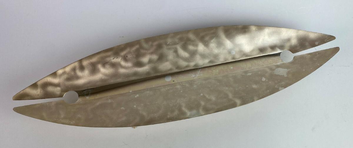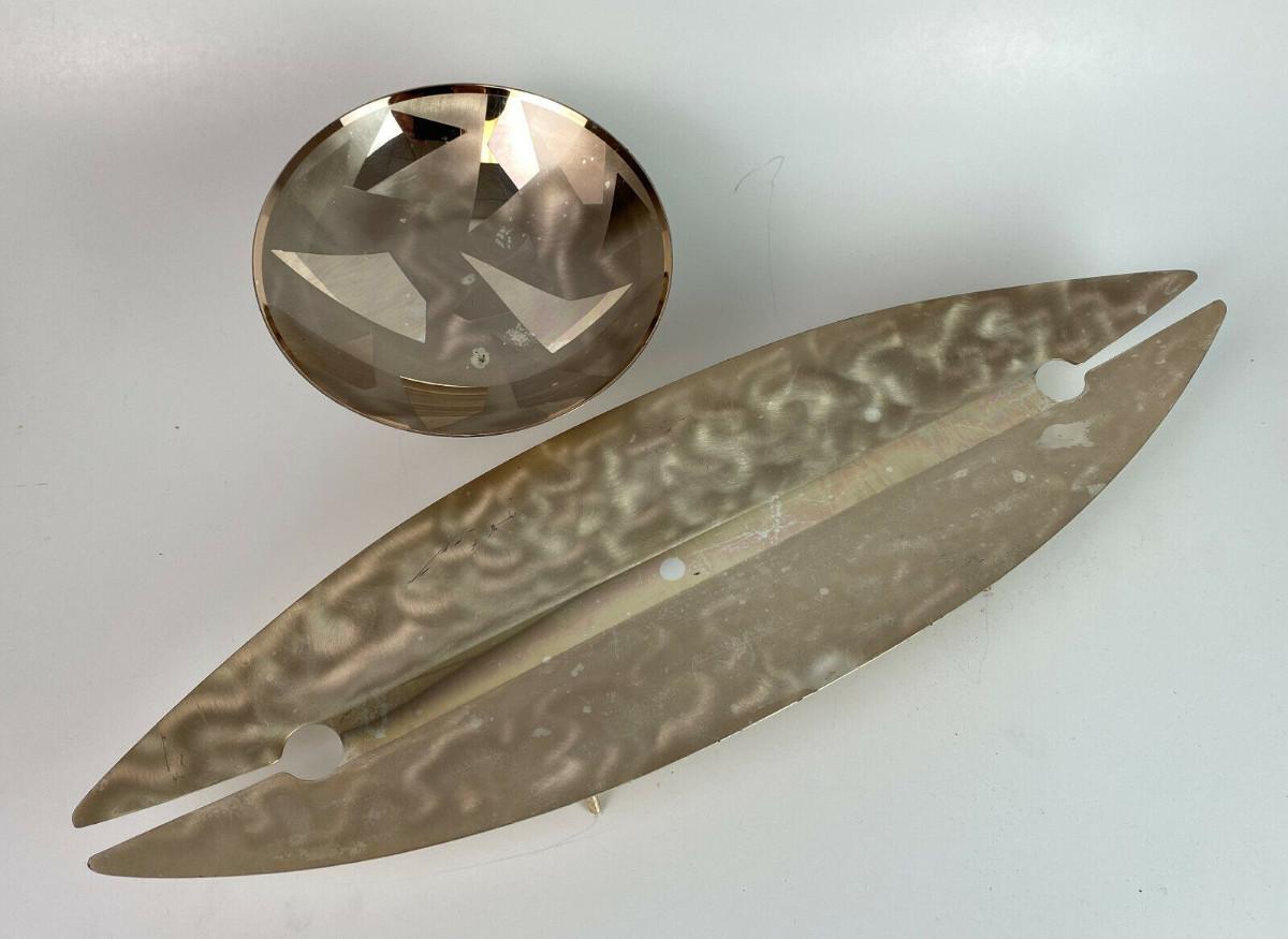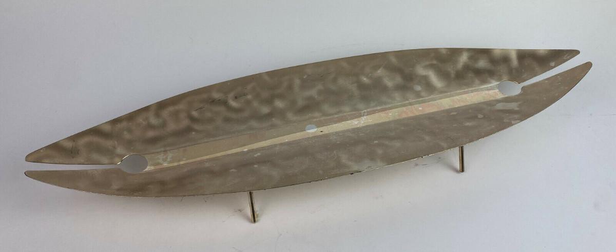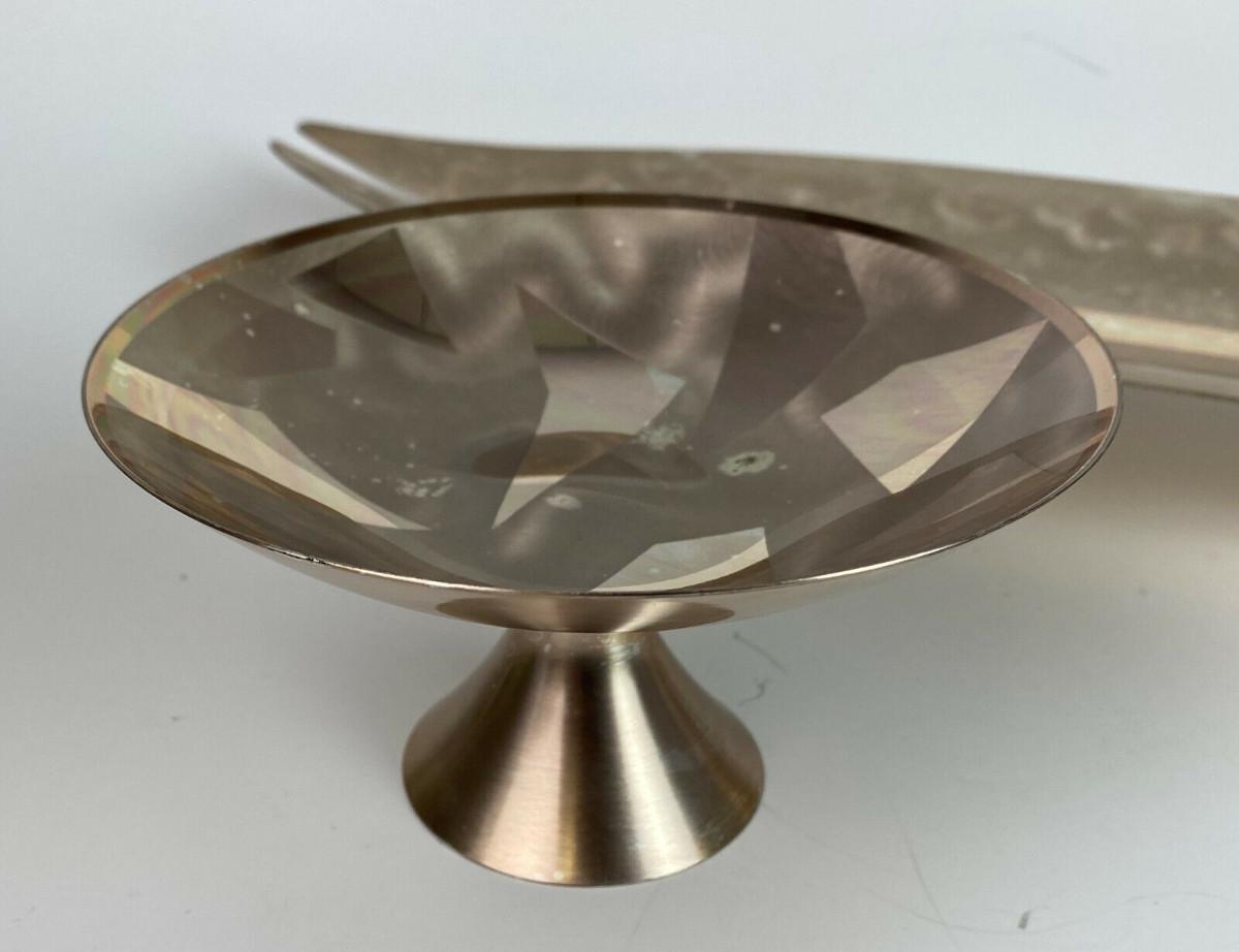 Here are a pair of Mid Century Modern trays from the Ikora line of silverplate holloware by WMF(Wurttembergische Metallwarenfabrik)...The Space Age geometric shapes are great but there is a fair amount of wear and some marks on the Ikora finish...first produced in the late twenties by WMF in Germany...The long footed tray is 18 x 5 x 2"...and the compote is is 5"...As shown.