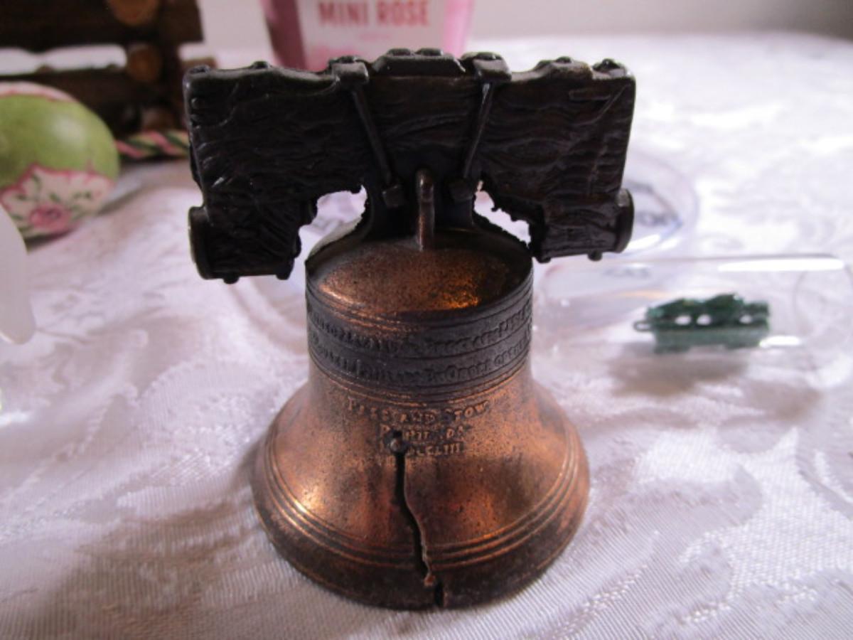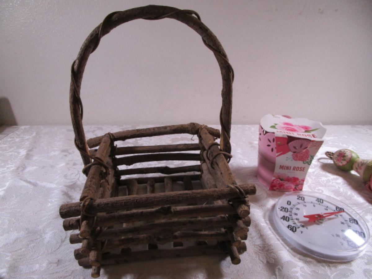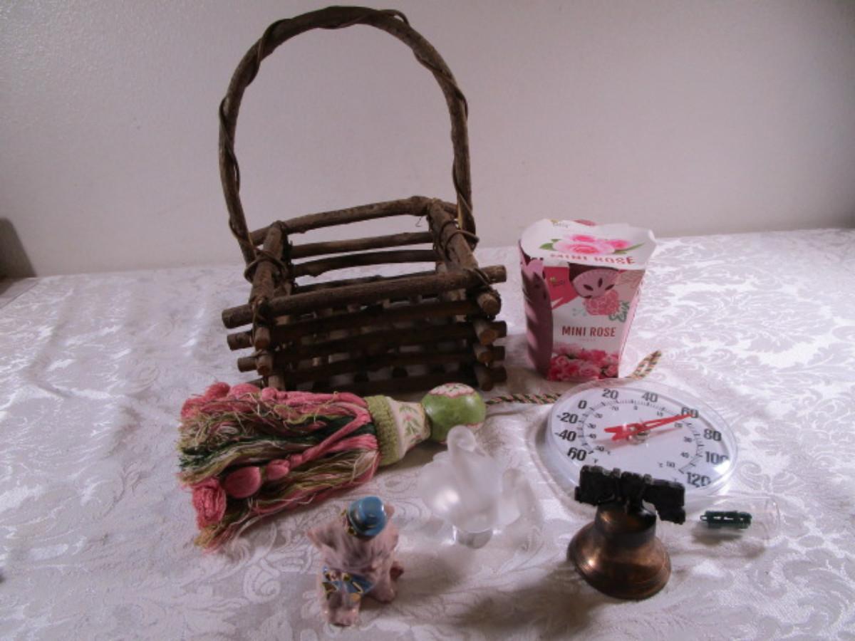 basket is 8-1/2 x 8-1/2" x 12-1/4" tall, liberty bell, swan figurine, kitten figurine, thermometer