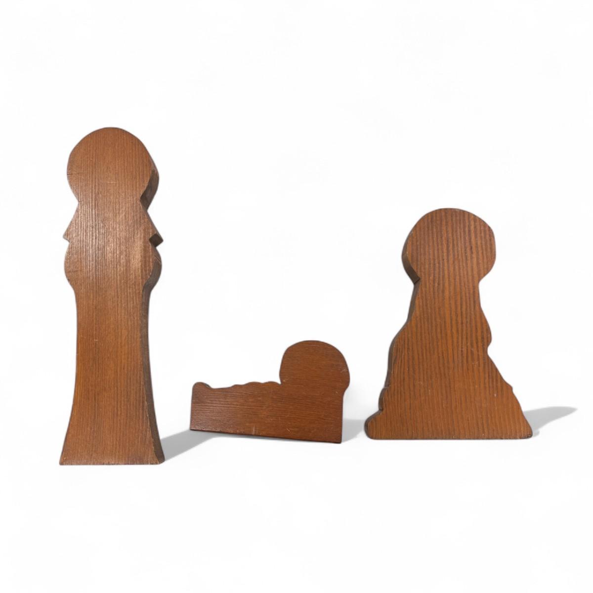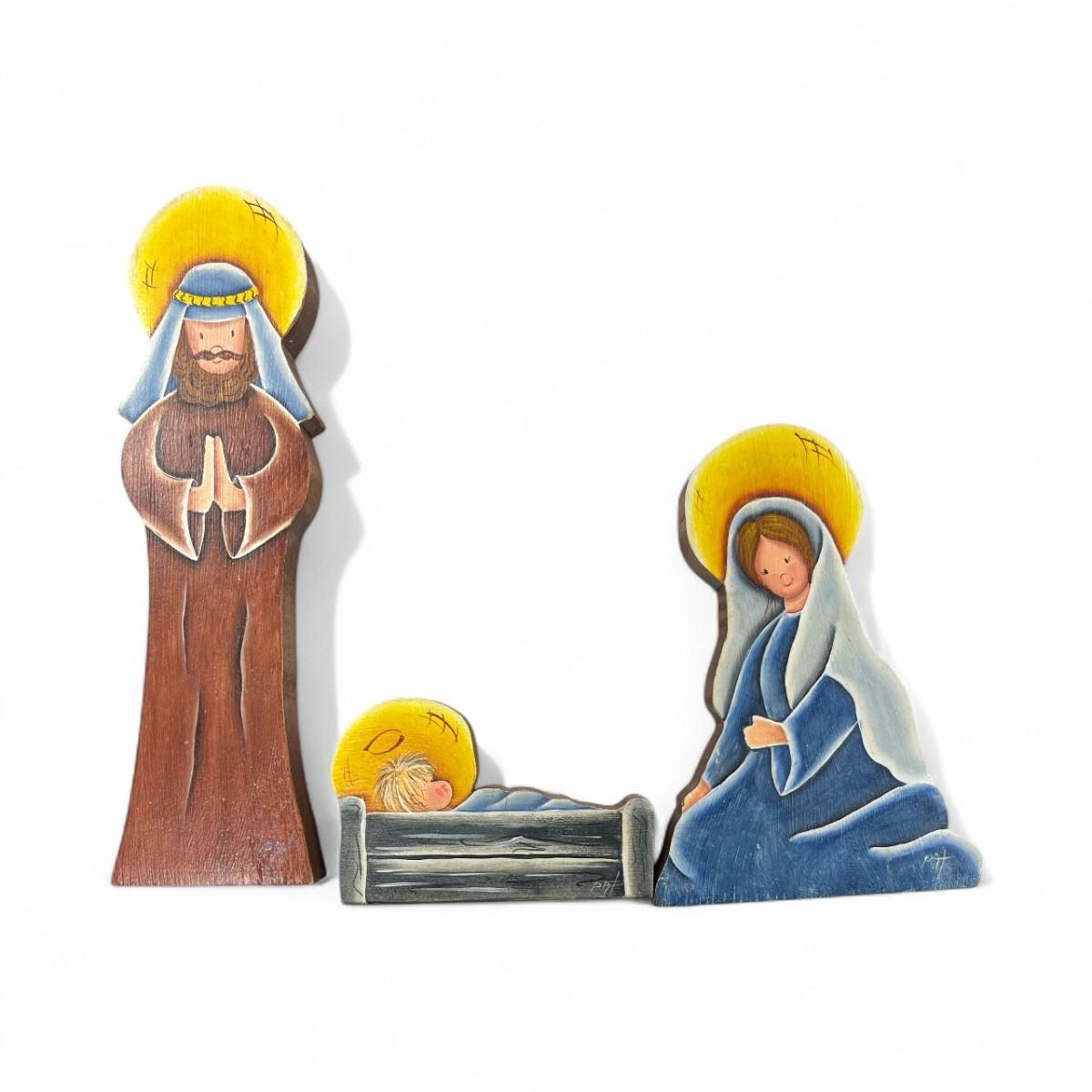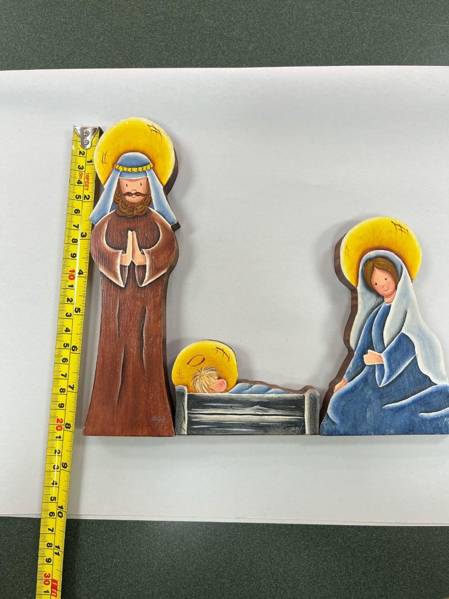 Wooden Hand Painted Nativity Scene with Mary, Joseph and Baby Jesus. Signed by the Artist