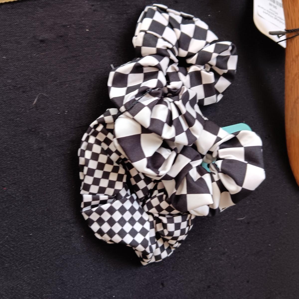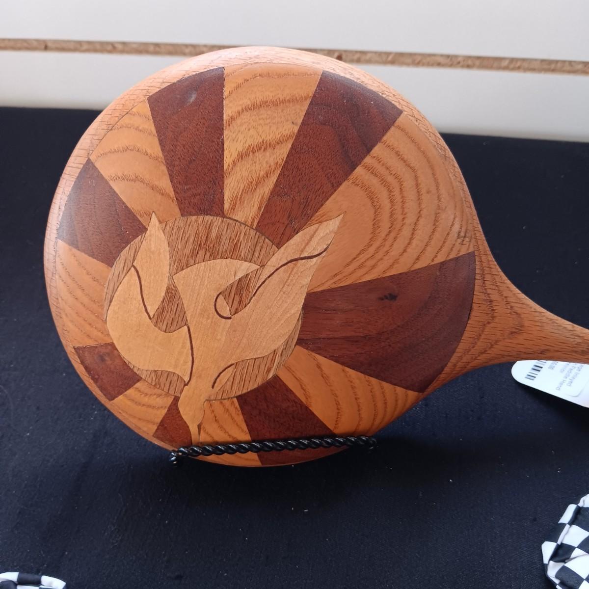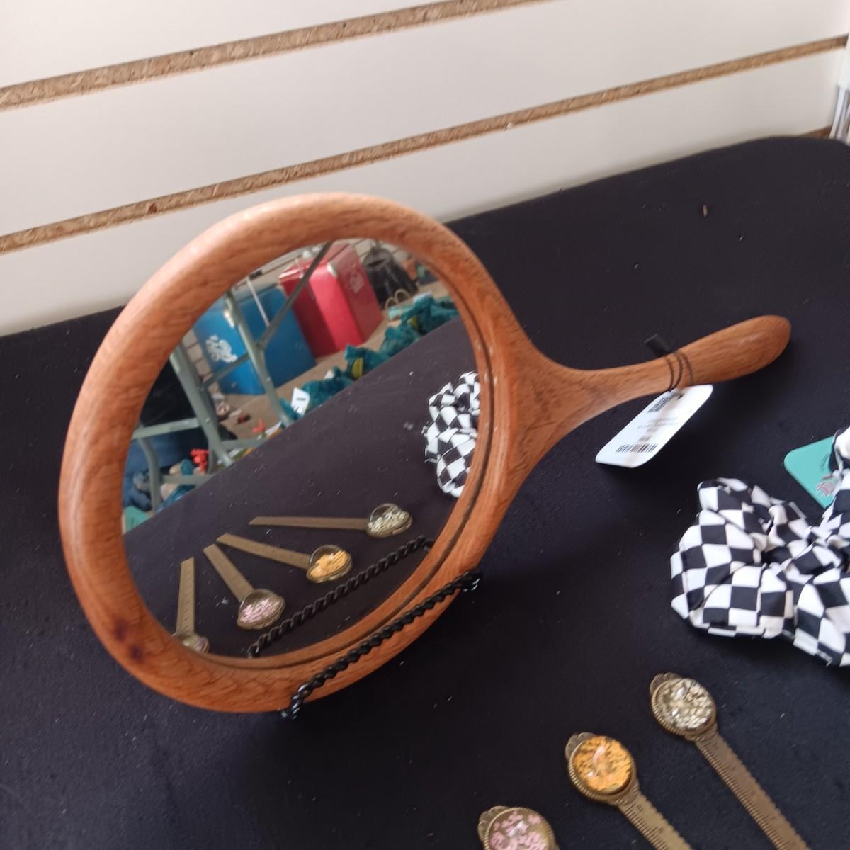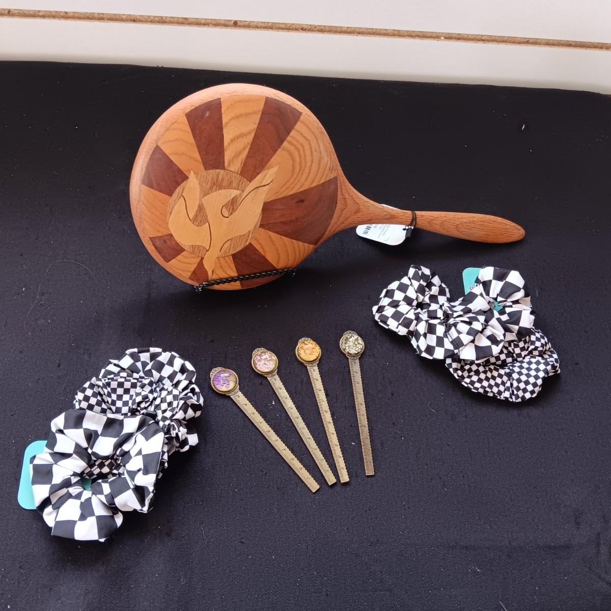 WOODEN INLAID HAND MIRROR, HAIR SCRUNCHIES AND LETTER OPENERS