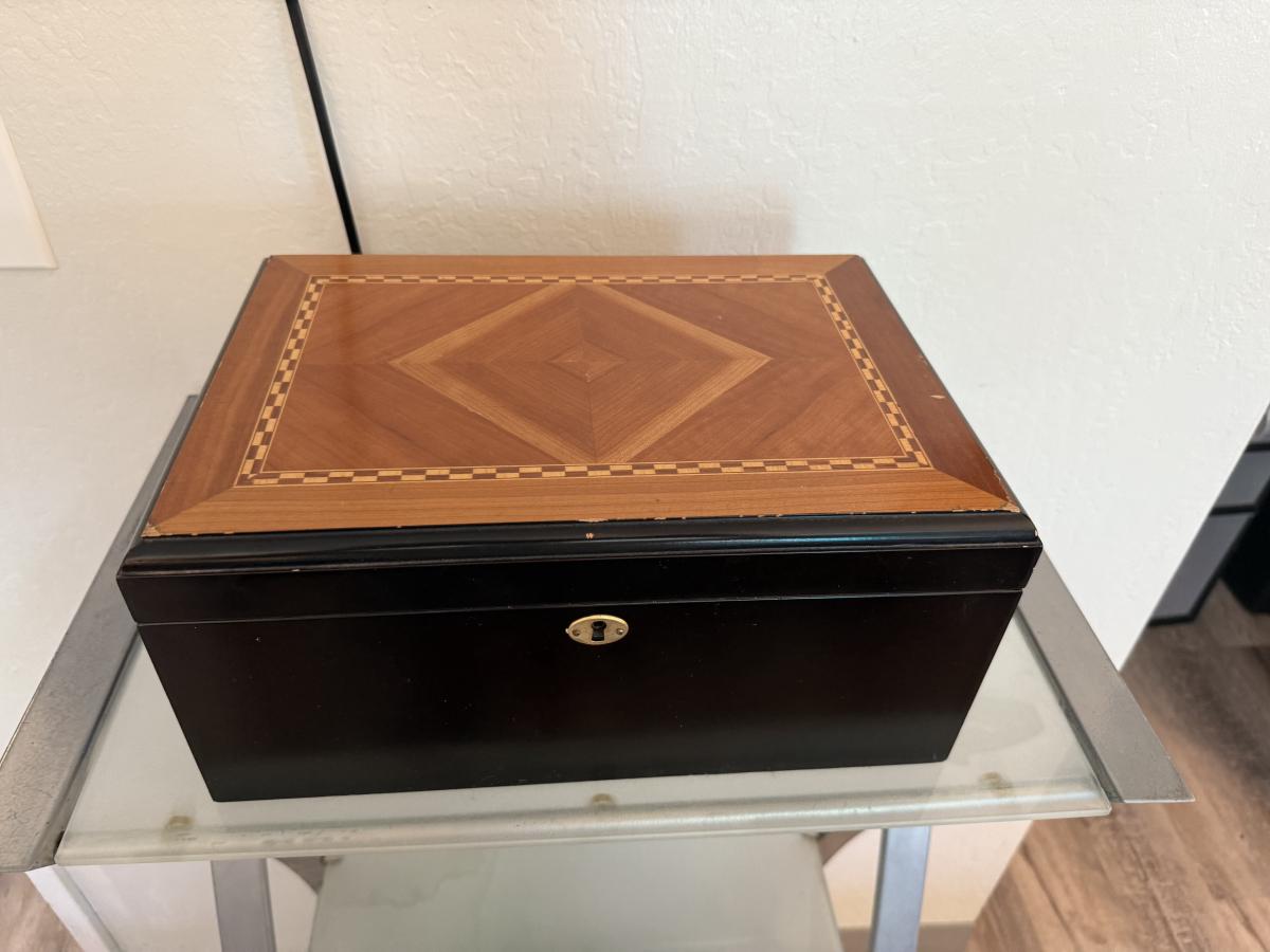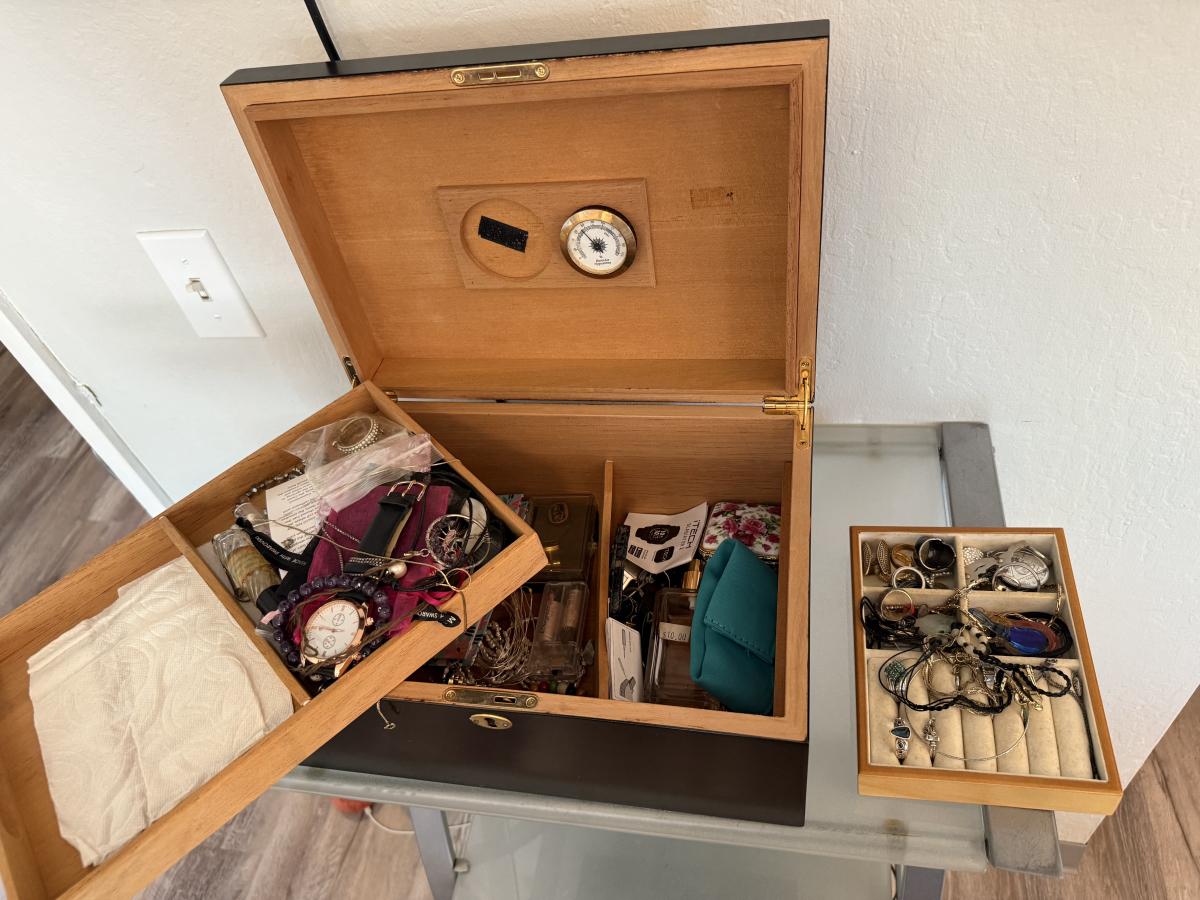 Large wooden jewelry chest with compartments and drawers, includes assorted jewelry and accessories.
