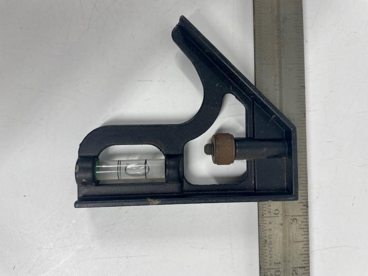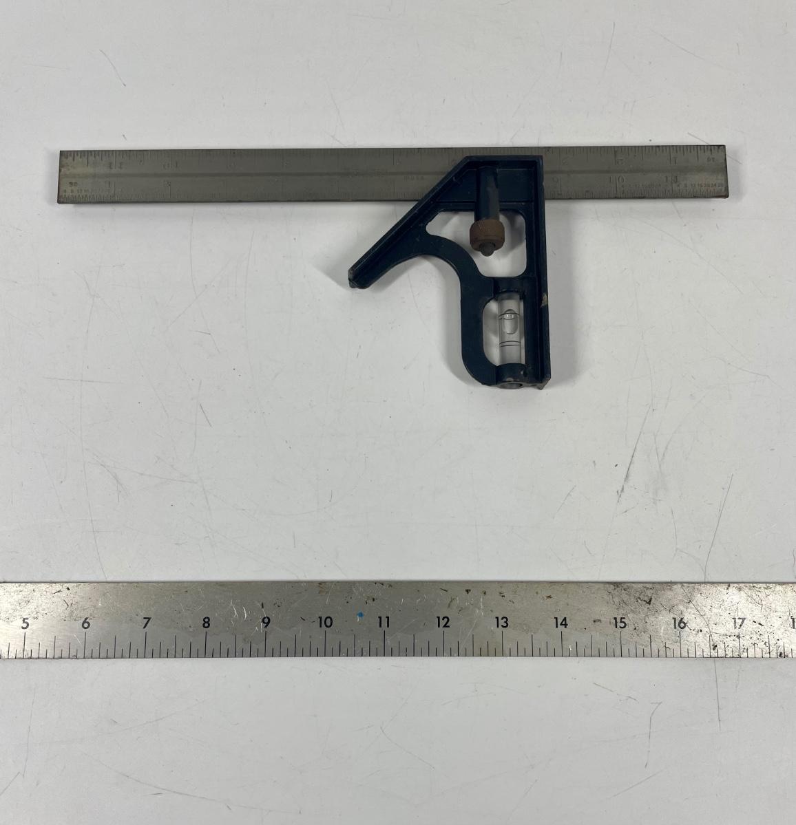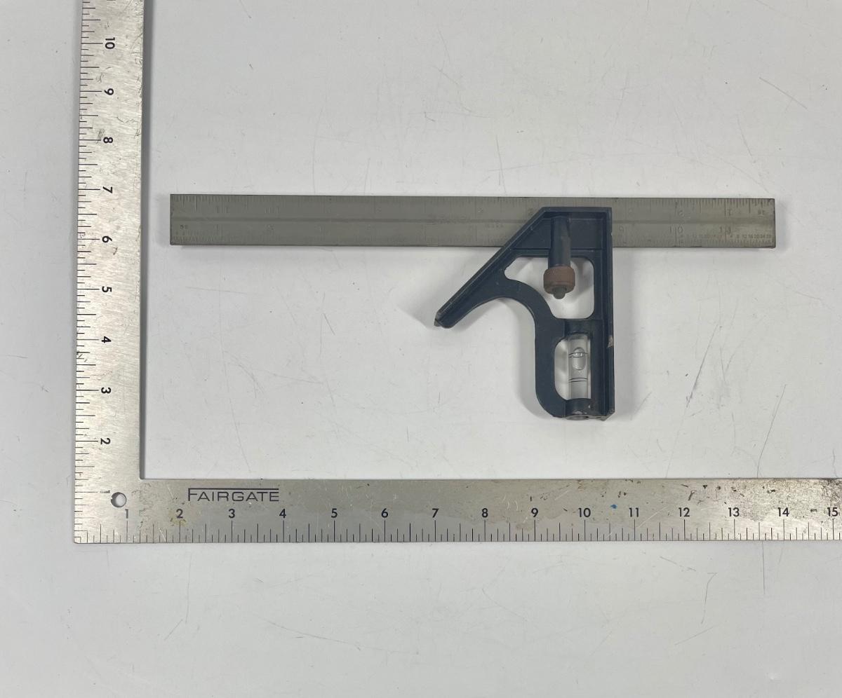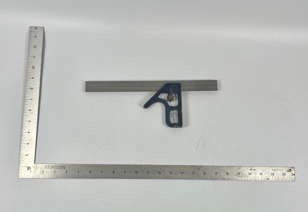11" Combination Carpenter Square and 24" x 14" Fairgate Aluminum Framing Square. Both in very good used condition.
