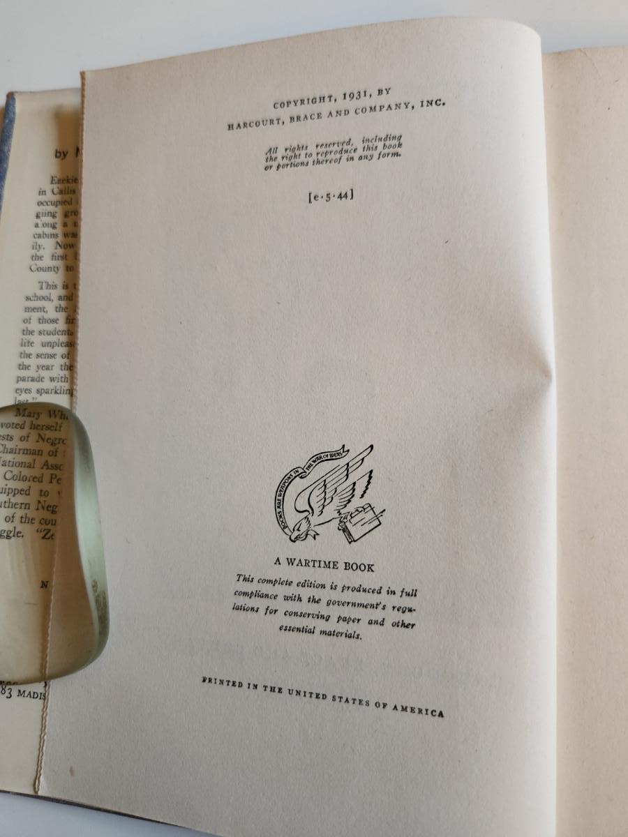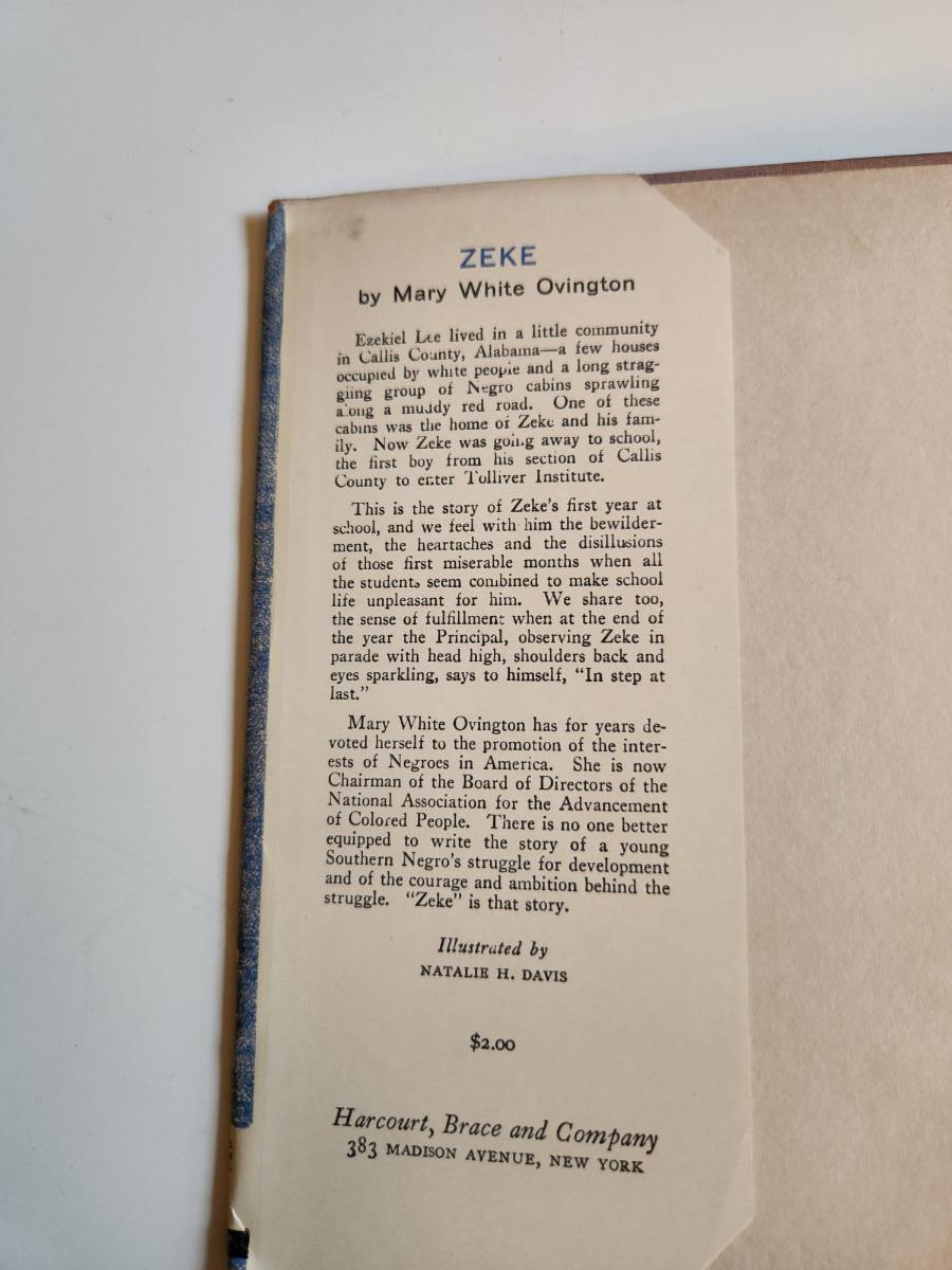 This auction lot is for a copy of the very rare book ZEKE by Mary White Ovington. This vintage first edition is in good condition for its age. The dust cover has come coloring fading, with edge crack and minor tears - see photo of the upper left corner of the dust jacket. The book is hard bound with 105 pages. The book was published by Harcourt, Brace and Company in 1931. Ms. Ovington - a founder of NAACP, tells the story of a young Southern Negro's struggle for development and courage. Note: this book is not autographed, but a fine collector's piece.