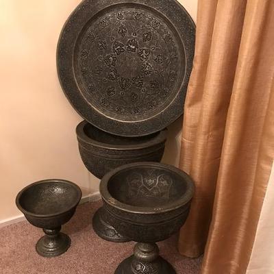Beautiful Persian engraved vase / Ghalamzani. This one of the kind original Persian handicraft is engraved and embossing with hand and has a elaborate designs, patterns and shapes on copper. It has been made over 50 years ago in city of Isfahan. Inspired by the graceful and romantic lifestyles of the Persians, the painting emphasizes the lives of the royalty of the times. 169 / 192 -