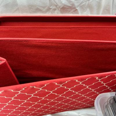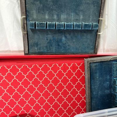 These many trays fit in the plastic bin, but as of now I don't have the matched top. There are two large foldable bins, vintage spoon holders and a ring box. The many different shaped holders are somewhat dusty, and have plastic covers for some. The pop up photo box comes with 2 lights, no tripod. These trays are great for transporting jewelry to shows, or storage. 13 / 1597 -