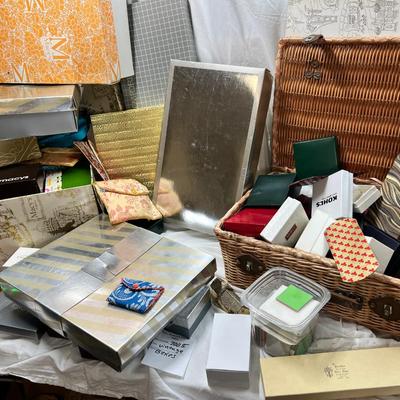 These many trays fit in the plastic bin, but as of now I don't have the matched top. There are two large foldable bins, vintage spoon holders and a ring box. The many different shaped holders are somewhat dusty, and have plastic covers for some. The pop up photo box comes with 2 lights, no tripod. These trays are great for transporting jewelry to shows, or storage. 14 / 1597 -
