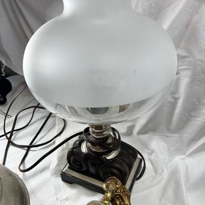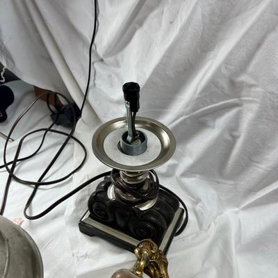 Metal hall light antique swag, for repair or parts. Oil lamps with glass chimneys . Electric light with large mat and clear glass shade, for parts, Do you see the turtle? Its a stained glass shell on top of a wooden pen holder. Hanging electric bulb lights with controller. $25.00 surcharge to ship. 98 / 1597