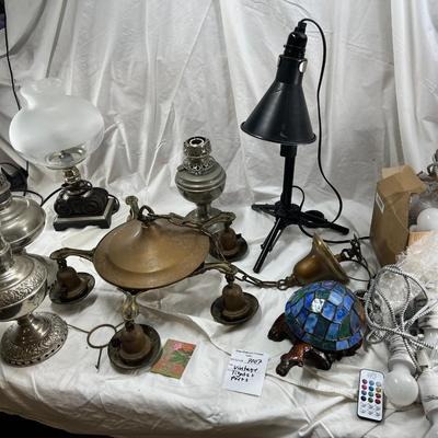 Metal hall light antique swag, for repair or parts. Oil lamps with glass chimneys . Electric light with large mat and clear glass shade, for parts, Do you see the turtle? Its a stained glass shell on top of a wooden pen holder. Hanging electric bulb lights with controller. $25.00 surcharge to ship. 87 / 1597 -