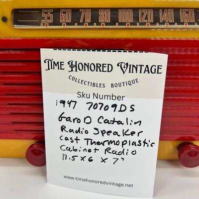 Beautiful Highly Marbleized Bright yellow Garod with red Wrap-Around Grilleand red knobs Striking Bright Red + Yellow Catalin Garod model 6AU-1 'Commander- made by the Garod Radio Corporation in 1945. This sleek Art Deco catalin radio has a streamlined design emphasized with the less often seen wrap-around grille. The bright yellow cabinet with it's intense marbleizing adds to the display quality of this radio. The bright red color is brought out even more with its contrasting red trim. The radio is in original, untouched condition, and is just a stunning example of this Catalin Garod model. The cabinet + trim have no cracks, burn marks, repairs, or chips and all trim pieces are original to the radio. This set retains its original cardboard back which is in great condition and manufacturers stickers affixed to the bottom of cabinet. This is an exceptional and rare tube radio that looks like it has been well cared for showing small light scratches consistent with light use. It would make a great addition to any Radio or Art Deco Collection. Radio measures approximately: 11" Wide x 6.5" High x 6" Deep. This set is sold "as-is + untested", the chassis seems complete. Set is being sold as a "non-working" vintage electronic device that should be gone over by a qualified technician prior to use. 61 / 1271 sold -