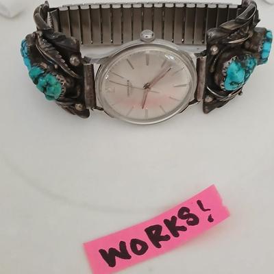 This watch does make sound when wound. The watch in the image is a Longines watch with an initialed Navajo sterling silver and turquoise watch band. These types of watch bands became popular in the Native American jewelry market starting in the 1940s, with a peak in the 1970s. The watch band is crafted from sterling silver and features turquoise stones. It has an elastic band, between the silver and turquoise bands, so size fits all. 47 / 7371 sold -