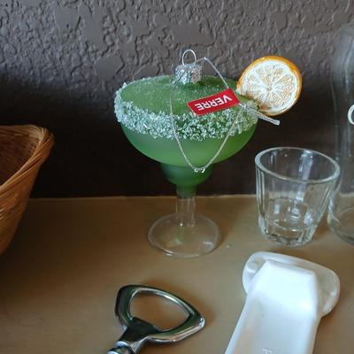 A fun and functional assortment of bar accessories and glassware, includes: 4 large rounded cocktail or margarita glasses 4 assorted pint glasses (Coca-Cola, Coors, and others) 2 vintage Pheasent hunter shot glasses 1 small margarita-style ornament Corkscrew wine opener Clear glass ashtray Basket with ~20 corks Bordeaux wine pourer with original packaging Great starter bar set or gift bundle. Most pieces in excellent vintage condition. 3021 / 4588 -