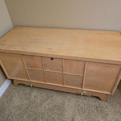 Classic and collectible, this authentic Lane Cedar Chest features clean lines and a blonde oak finish with a paneled front designβideal for Mid-Century Modern interiors. Crafted by Lane of Altavista, Virginia, this chest includes the original Lane key envelope (key not pictured), and retains the signature aromatic red cedar interior, perfect for preserving linens or keepsakes. Features: Original Lane branding and paper insert Red cedar interior with locking mechanism Paneled front, sculpted feet, and integrated drawer pulls Approx. 46" W x 17" D x 22" H Condition: Very good vintage condition with some wear to the top surface. Interior is clean and retains cedar scent. A timeless heirloom piece from a trusted American furniture maker. Safety Disclaimer: This chest includes its original locking mechanism. However, in accordance with consumer safety guidelines, Lane cedar chests manufactured prior to 1987 may pose a risk of entrapment to children if the lock engages while the lid is closed. The current lock has not been replaced with the updated child-safety version issued by Lane. Buyer assumes responsibility for ensuring the chest is used safely. For homes with children, we strongly recommend either removing or disabling the lock, or contacting Lane Furniture (now a division of United Furniture Industries) for a free safety lock replacement kit. 3320 / 4588 sold -