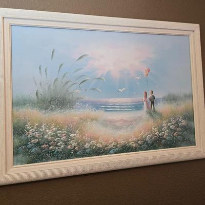 This peaceful and sentimental framed painting captures two children standing hand-in-hand at the ocean's edge, balloons in hand, under a glowing sunrise sky. Soft pastels and delicate brushwork bring the coastal wildflowers and gentle waves to life. The canvas is signed by the artist in the lower right corner. Details: Medium: Acrylic or oil on canvas board (not a print) Signature: Present, lower right corner (unverified) Frame: Whitewashed wood Condition: Excellent; no visible damage or wear Ideal for a nursery, beach house, or calming bedroom dΓ©cor. 3379 / 4588 sold -