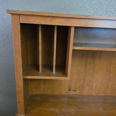 Get organized with this two-piece office furniture set, ideal for home workspaces or student areas. Includes a compact desk with upper hutch and a coordinating media/storage cabinet. Both pieces are in a warm woodgrain laminate finish. Includes: Computer Desk with Hutch: Slide-out keyboard tray Upper cubbies and shelf for books or dΓ©cor Lower cabinet and open CPU shelf Approx. 56"x 43.5" x 19.5" Media/Storage Cabinet: 2 adjustable open shelves Side cabinet with door Great for DVDs, books, or gaming consoles Measures Approx. 24" x 28" x 16" Condition: Structurally sound with wear consistent with age. Some scuffs and a visible interior crack on desk hutch (see photos). 3504 / 4588 -