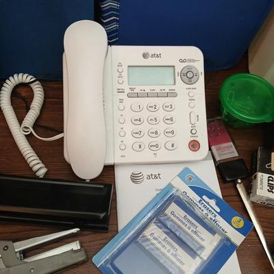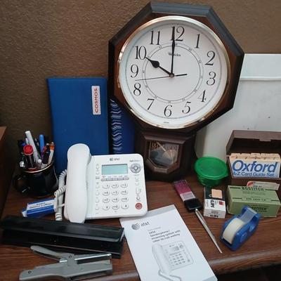 Classic office setup with useful supplies and retro charm! This lot includes: Wood-framed Wall Clock (Regulator-style, quartz movement, by Westclox) AT&T Corded Phone with speakerphone and manual Oxford AβZ Card File Box with Guides Pens, scissors, highlighters, and tape dispenser 3-Hole Punch, stapler, staple remover, and Bostitch staples Misc. office items: eraser, pen stand, paper bin, lighter, notepad Great condition overall with light signs of useβideal for a retro home office, prop use, or backup workstation. 3538 / 4588 sold -