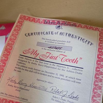 This heartwarming collectible from Ashton-Drake’s So Truly Yours series is titled “My First Tooth”, sculpted by artist Kathy Barry-Hippensteel. This hand-painted porcelain baby is dressed in a teal velour romper with white lace collar and comes with a removable pacifier. Includes: Certificate of Authenticity Artist profile and photo insert Original promotional image A sweet and expressive doll, perfect for collectors or nursery decor. Condition: Excellent. Clean, well-kept, and complete. No original box. 4120 / 4588 sold -