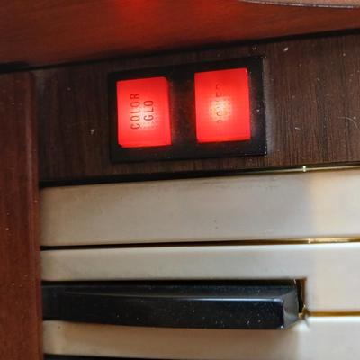 Classic Hammond Colonnade 2202 electric organ featuring dual keyboards, built-in rhythm accompaniment, foot pedals, and vintage wood cabinet styling. Includes: Original matching bench with lift-top storage Assorted vintage sheet music and hymnals (Exodus, I Believe, gospel, classics, and more – titles visible in photos) Three hymnals/books stacked on top (as shown) Condition: Powers on and produces sound; not fully tested for functionality. Some cosmetic wear consistent with age. Sheet music shows expected wear from use and age. Perfect for musicians, collectors, or those seeking a retro home music feature. 4166 / 4588 -