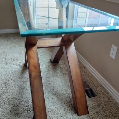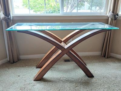 Striking and sophisticated, this rectangular glass-top table features a thick beveled edge and a sculptural crisscross wood base in a rich walnut finish. Ideal as an entryway, sofa, or accent table to elevate your modern or contemporary decor. Glass top approx. ½" thick with polished edges Sturdy hardwood base with curved intersecting legs Dimensions approx. 30" x 54" x 20" Condition: Excellent – no cracks or chips in the glass, minimal surface wear. 4197 / 4588 -