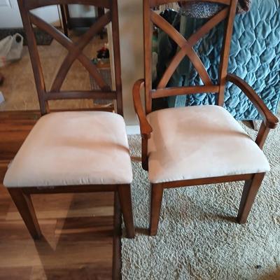 This striking dining set features a substantial beveled-edge glass tabletop mounted on a sculptural wood base with rich warm tones and architectural curved supports. The glass top offers an elegant, airy feel while showcasing the unique craftsmanship of the wood frame. The set includes six high-back chairs with matching X-back designs and upholstered seats, combining comfort with style. Perfect for both traditional and modern interiors. Generously sized to seat 6 guests comfortably, this table is perfect for dinner parties, family gatherings, or as a statement piece in a stylish home. Excellent condition with minimal signs of use (1 chair has a dirty seat as shown). Approx. Dimensions: 29.5" x 72" x 42" Chairs are 41.5" x 24" x 22" A standout piece with designer flair—ready to refresh your space. While unmarked, the design and quality are reminiscent of collections by Broyhill, Magnussen Home, or Hammary, known for blending modern lines with rustic and craftsman elements. 4248 / 4588 -