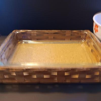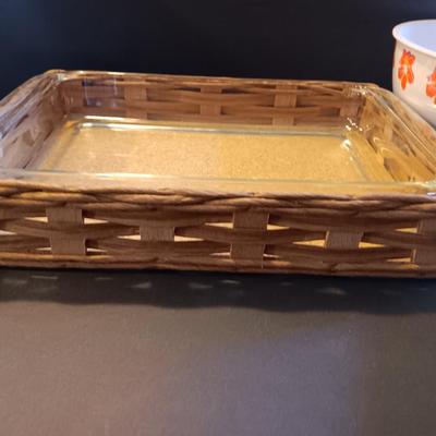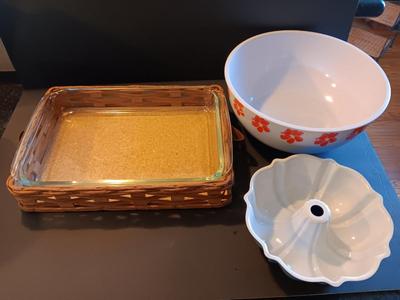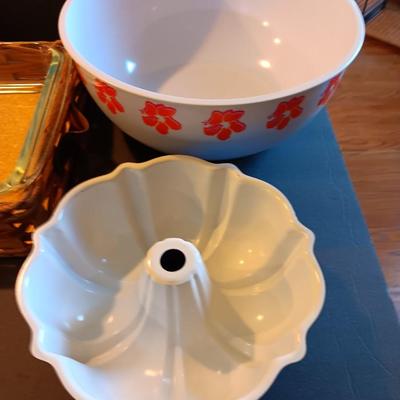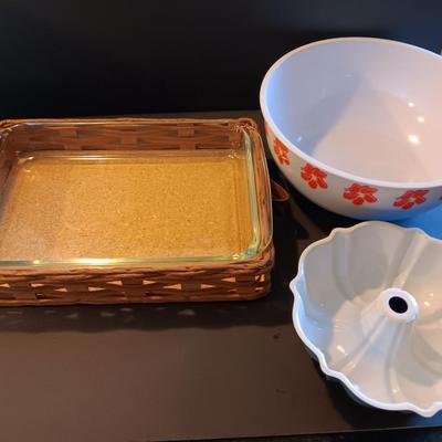 Pyrex cake pan with Basket - plastic salad bowl - and Bundt cake pan 2245 / 3002 sold -