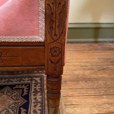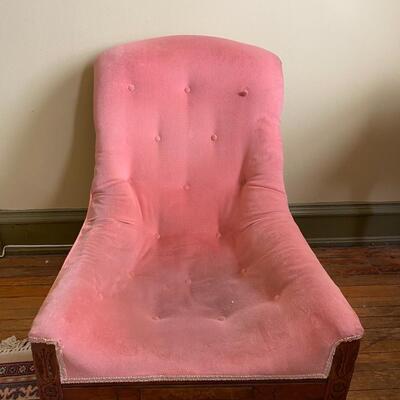 Wingback Sleep Chair In Pink Velvet With Dark Wood Stained Legs - JB11188 LOCATION: Washington, DC. DETAILS + DIMENSIONS: 26"W x 24"D x 34"H Seat Height 14" Seat Depth 14" CONDITION: Fabric needs upholstering Please refer to photos for a more detailed look at condition. We make every attempt to list and photograph any defects or signs of wear that are significant to this sale. LOCAL PICK UP WASHINGTON DC. BUYER IS RESPONSIBLE FOR ANY NECESSARY DISASSEMBLY AND ALL COSTS ASSOCIATED WITH SHIPPING OR PICK UP. PLEASE CONTACT US FOR SHIPPING REFERRALS. 91 / 92 -