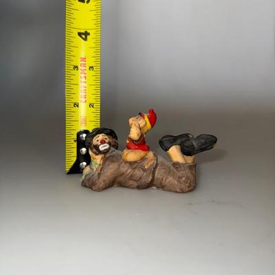 Presenting an Emmett Kelly Jr. miniature clown figurine standing with a playful monkey—part of the beloved Emmett Kelly Jr. collection. This charming piece captures the whimsical spirit of the iconic hobo clown and his mischievous companion, showcasing detailed craftsmanship and vibrant colors. Please note that this figurine is sold without its original box. It's a delightful addition for collectors or a perfect accent for any home decor. Don’t miss out on the chance to own this unique piece! 20 / 878 sold -