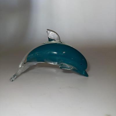 Introducing the stunning Dolphin Art Glass figurine, featuring a captivating design in dark teal and clear glass. This exquisite piece showcases the graceful form of a dolphin, expertly crafted to highlight the beautiful interplay of colors and light. The dark teal glass creates a rich, deep hue, while the clear accents add a touch of elegance and depth to the overall design. Perfect for display on a shelf, table, or as part of a curated collection, this dolphin figurine adds a touch of coastal charm and sophistication to any space. Ideal for marine life enthusiasts or as a unique gift, this art glass piece is sure to be a standout accent in any home! 95 / 878 sold -
