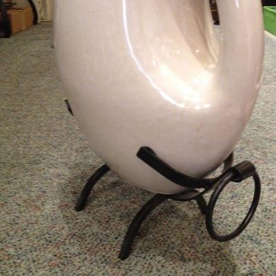 This is a large ewer,,,,,,in an iron stand. It is an off-white glazed ceramic piece - very unusual. It measures 24-inches tall X 16-inches wide. There are two tiny chips in the glaze surface as pictured - barely noticeable. Quite a conversation piece, great for decor on a patio or terrace or large bathroom. LOCAL PICK-UP ONLY - shipping not available on this item. 372 / 538 -