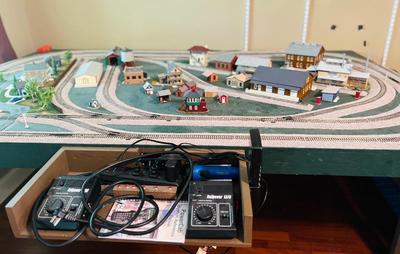 MASSIVE Train Table! Measures 8 Feet Long, 5 Feet Deep and over 3 feet tall (37 inches) comes with all the accessories that you see, including approximately 30 buildings, various cars, people, and other accessories. Tracks are attached to the table. Some of the buildings and other accessories are removable. Nothing pictured was not tested. Bring help to disassemble and move this as it is solid wood! HO Scale 690 / 856 sold