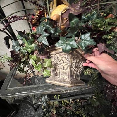 A lovely assortment of faux flowers, fruit and foliage in this lot. Lot includes a couple of larger mixed bouquets and a handful of smaller ones and also a small bunch of mistletoe foliage. Slightly dusty from storage. Most arrangements have a resin base on florists foam but there are also ceramic and resin plant pot bases. The largest arrangement is in a resin urn shaped pedestal pot, it measures 45†x 17†x 20â€H. Bakers rack is not included in this lot but is for sale in a separate lot in this auction. Local Pickup Only 1099 / 1429 sold -