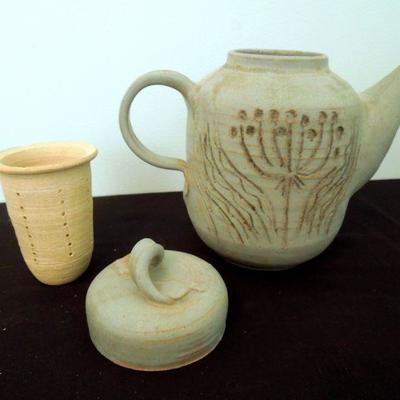 A Sinclair Ashley (Chattanooga, TN) corked jar 6" x 5.5". He produced at Rising Fawn studios. A Michael Pitts stoneware scored 4.5" honey jar. A 6"H D. Lewis swirled etched stoneware flared lip vase. a "Legatha 77" covered crock with glossy blue-green glaze and a "H" stoneware pitcher with emerald green band measuring 6"W x 8" H. No cracks, chips or kiln marks noted. Living estate of Charles Rathbun. 2250 / 2771 sold -