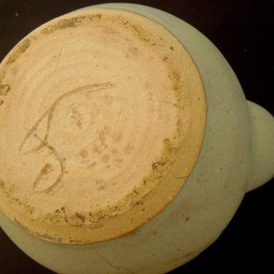 A Sinclair Ashley (Chattanooga, TN) corked jar 6" x 5.5". He produced at Rising Fawn studios. A Michael Pitts stoneware scored 4.5" honey jar. A 6"H D. Lewis swirled etched stoneware flared lip vase. a "Legatha 77" covered crock with glossy blue-green glaze and a "H" stoneware pitcher with emerald green band measuring 6"W x 8" H. No cracks, chips or kiln marks noted. Living estate of Charles Rathbun. 2246 / 2771 sold -