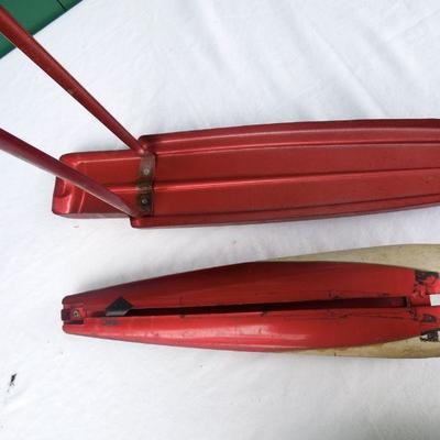 National Vulcanized Fibre trunk 31" x 17" x 13" with metal lock (no key); Trunk has a wooden shelf insert and trunk has an Indian head decal. Stanleys Grill baseball uniform size 36 with moth holes (especially pants); two Louisville slugger bats (one is little league size); a canvas Drybak child's fishing vest; a Cub Scout cap; 3 cotton vintage baseball caps; a "S" green cotton wool blend baseball cap; a pair of green and white nylon shin covers; a vintage protective jock strap cup and a metal "Sylva" license plate. 2423 / 2771 sold -