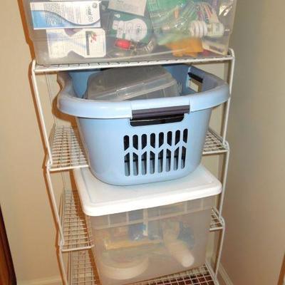 This grouping includes 4 stacking coated wire storage shelves with no rust, a plastic laundry basket, an OXO stainless and plastic 2 compartment dish drainer with mats; a CVS Pharmacy glass bathroom scale; a plastic covered bin full of various lighbulbs and flood lights; anothe plastic bin full of decorative paper plates, cups and napkins and other party goods. 2721 / 2771 sold -