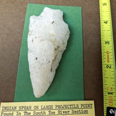 Impressive labeled collection of Native American relics, beads, tools, pottery shards and arrowheads and projectile points all excavated in various counties in North Carolina. Collection shows the county where items were found including Indian beads, spearhead and chisels from Hertford County, NC home of the Meherrin tribe; Cherokee drills and chisel from Yancey Co; a Native American sign found in Graham Co; an axe head found in guilford Co; a skinning knife and Tomahawk head from Yancey Co; a paint rock and game rock found in Cherokee Co; a gorget neck ornament from Clay Co; a spear head from Yancey Co; an axe head found in Madison Co; a Tomahawk from Madison Co; 3 peace pipes from various counties (see labels in photo); a Cherokee seal embroidered patch; a 28" wooden carved and painted Totem Pole. Top side of case has a crack from front to back about midway. When bidding on this case and contents, please keep in mind that you will be responsible for removing it from the residence. It is located in the basement and will have to be taken up a narrow flight of stairs. Please bring your own packing and moving material as well as muscle. Will schedule a specific time to avoid overcrowding during pickup. will sell without case for same price if desired. Case is identical to lot # 114. 2745 / 2771 sold -