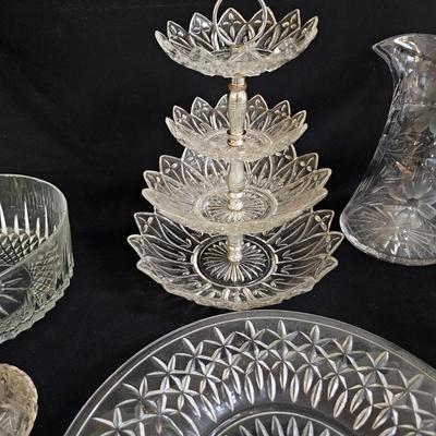 Ten assorted pieces of clear glass, bowls, trays, a pitcher and more. The tiered tray measures 10" D x 12"H, the pitcher is 6" x 8" x 9.5"H and the pedestal plate is 12" D x 2.5"H. One three legged round bowl, a cream & sugar set and two glass knife rests. Appears to have floral foam residue left in one of the bowls. See photos for details. Local pickup only. 3214 / 5261 sold -