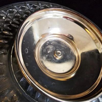 Ten assorted pieces of clear glass, bowls, trays, a pitcher and more. The tiered tray measures 10" D x 12"H, the pitcher is 6" x 8" x 9.5"H and the pedestal plate is 12" D x 2.5"H. One three legged round bowl, a cream & sugar set and two glass knife rests. Appears to have floral foam residue left in one of the bowls. See photos for details. Local pickup only. 3221 / 5261 sold -