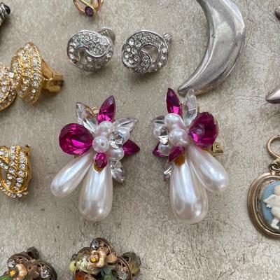 Over 35 pairs of clips earrings, both vintage and modern styles. Most are made of metal, the white mules appear to be ceramic, the large martinis are plastic, the moons are heavy and marked 925. One pair is missing a green gem, the blue cameo style with angels needs some glue. See images for examples of markings. Shipping available. All sales are final. No returns or refunds. Please bid accordingly. 3476 / 5261 sold -