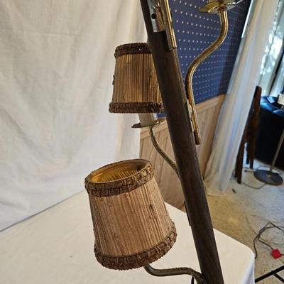 A very unique old style pole lamp with five bulb housings and shades. Unit is wood and metal, has compression spring at top to hold lamp secure on an eight foot ceiling. Has rotary switch and takes standard base bulbs. Lampshades are plastic and fiber, have clip style top of bulb holders. Lamp powered on when plugged in. Note that several of the protective sleeves on the lamp sockets are cracked and/or broken. See photos for details. Local pickup only. 1091 / 5545 sold -