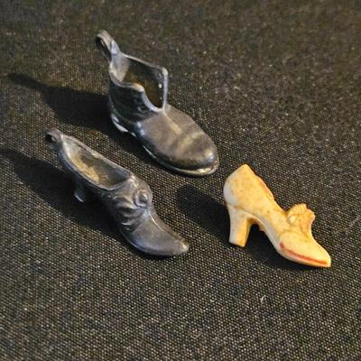 An assortment of over 20 tiny shoes. A majority are made of ceramics, but also include materials such as glass and metal, Lot features a metal heel as a pin cushion, and a few made in occupied Japan. The largest shoe with roses measures approximately 2" x 4.5" x 4.5"H. Shipping available. 1010 / 5545 sold -