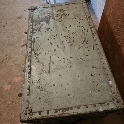 Vintage green metal over wood footlocker with inside storage tray. Locker has double clasps and an extra latch on front as original lock piece has no key. One leather handle missing on left side. Inside tray is wood with metal corners and supports, lifts out for extra storage below. Piece measures 31" x 17" x 13"H, has numerous scratches and scrapes on exterior. See photos for details. Local pickup only. 1199 / 5545 sold -