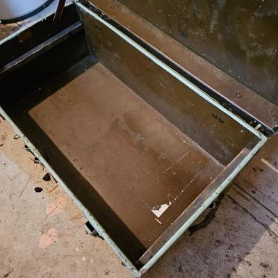 Vintage green metal over wood footlocker with inside storage tray. Locker has double clasps and an extra latch on front as original lock piece has no key. One leather handle missing on left side. Inside tray is wood with metal corners and supports, lifts out for extra storage below. Piece measures 31" x 17" x 13"H, has numerous scratches and scrapes on exterior. See photos for details. Local pickup only. 1203 / 5545 sold -