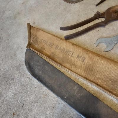 Two toolboxes and assorted hand tools. Stack-On box is 19" x 9" x 9"H, has lift out tray. Machete is 23" long, has military sheath labeled 'spare barrel'. One propane torch, pliers, screwdrivers, wrenches and more. One Sears Evolv electric drill, powered on when plugged in. Scrapers, caulk guns and more. See photos for details. Local pickup only. 1300 / 5545 sold