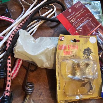 General selection of screws, nails, fasteners, hooks and more. Two short lengths of 12-2 w/ground wire. Small storage drawers with hardware inside. Turnbuckles, straps etc. Also some paint rollers, foam brushes, edge painters, drop cloths and wallpaper tools. See photos for details. Shipping available. 1355 / 5545 sold -