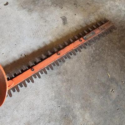 Two blowers and a hedge trimmer make up this lot. Small red Homelite blower is two speed, measures 6" x 29" long. Black & Decker hedge trimmer has 16" blade, measures 7" x 35" long. Handle has had some repair. Large unit is also Black & Decker and is a combo blower/vacuum, interchanging pieces and a mulching bag. 18" x 43" long. All units powered on when plugged in. See photos for details. Local pickup only. 1341 / 5545 sold -