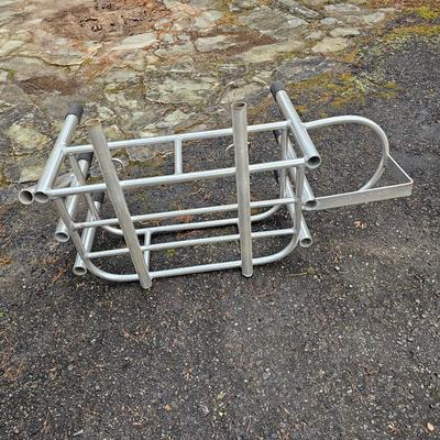 One welded aluminum rod holder that mounts onto mount on vehicle, most likely used for surf fishing. Holder has places for seven rods, a cooler and a bait bucket. Tubing diameter is approximately 1.75" for the rod openings, and 1.625" for the mounting tubes. No mounting bracket included. Unit measures 51" x 27" x 25"H, cooler opening is 16" x 30" and bait bucket area is 12"D. Also included is a homemade rod holder mounted to wood board, will hold five rods. Measures 26" x 30". See photos for details. Local pickup only. 1993 / 5545 sold -
